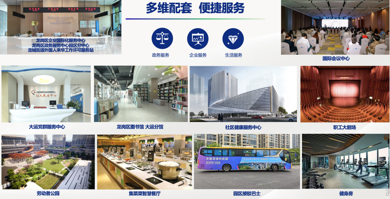 同时,园区与大运中心、大运山公园相邻,为企业员工提供文体休闲空间,并且有香港中文大学(深圳)、华中师范大学附属龙岗中学等名校环绕,解决了人才子女教育问题。