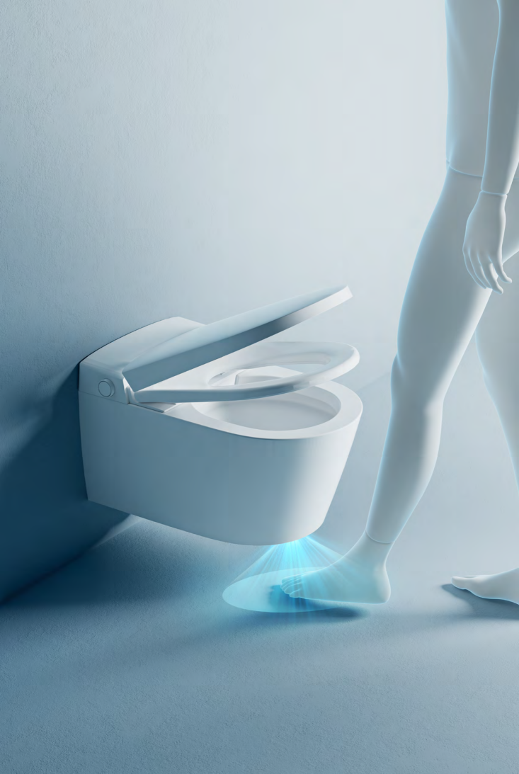 全息投影脚感感应: 伸脚即感应,翻盖/翻圈/冲水一气呵成,响应灵敏无需抬脚。离座自动合盖冲水,全程“零接触”,便捷体验跃然升级。