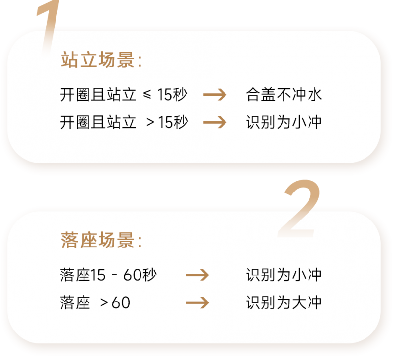 智能识别大小冲: 内置微波模块与AI算法,智能识别使用情况,精准触发大小冲水模式,节水环保与洁净效果兼得。