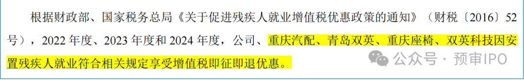值得一提的是,报告期内双英集团享受促进残疾人就业税收优惠金额3614.96万元、4144.38万元、4448.69万元,占利润总额的44.45%、36.03%、39.59%。同期,因支付残疾员工工资享受工资加计扣除企业所得税优惠金额分别为390.54万元、465.11万元、451.49万元,占利润总额的比例分别为4.80%、4.04%、4.02%。