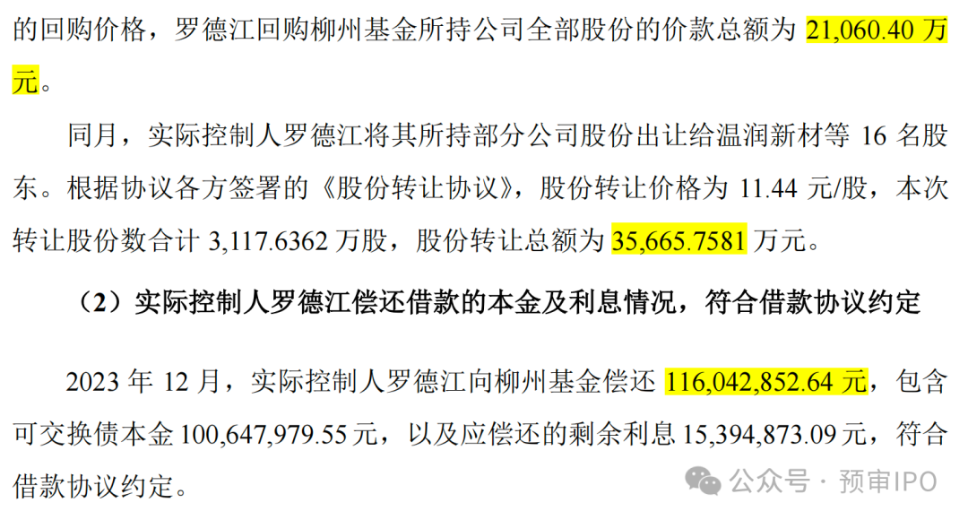 随后,罗德江将该部分股份以11.44元/股出让给温润新材等16名股东,对应投前估值12亿元,合计转让 3,117.6362万股,转让总额3.57亿元。