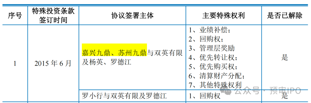 而“九鼎系”早早就参与了双英集团的投资和增资,被查时还是股东。招股书显示,2015年6月,双英集团实控人罗德江,通过转让股份以及新增注册资本的形式新增股东罗小行、嘉兴九鼎、苏州九鼎,并签署了包含业绩补偿、回购权、完成新三板挂牌等特殊性条款的协议。“九鼎系”旗下嘉兴九鼎、苏州九鼎通过其他特殊权利推荐有1名董事。