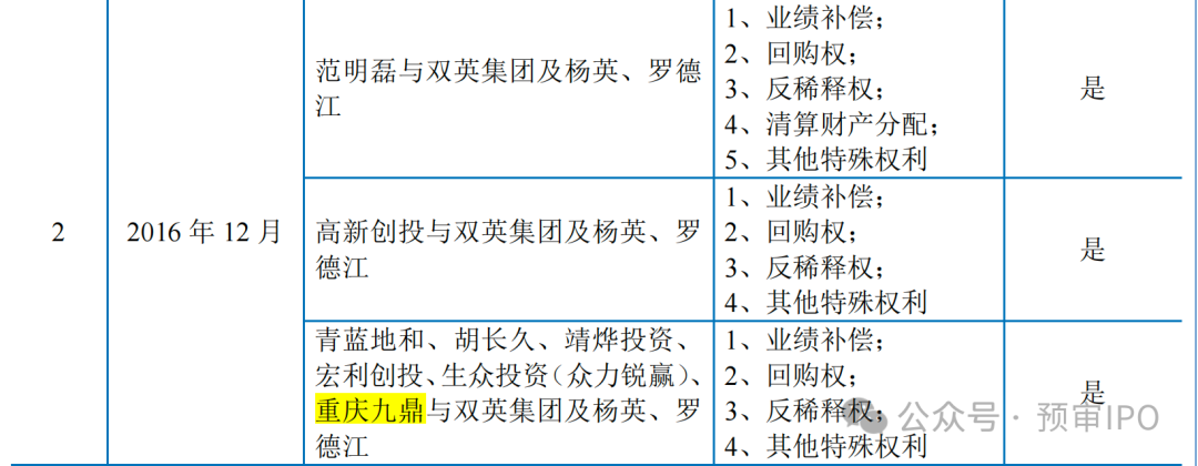 2016年6月16日,双英集团成功挂牌新三板,同年12月,包括高新创投、胡长久、重庆九鼎、靖烨投资在内的8名股东,对双英集团实施定增,同样签署了包含回购权等特殊性条款的对赌协议。