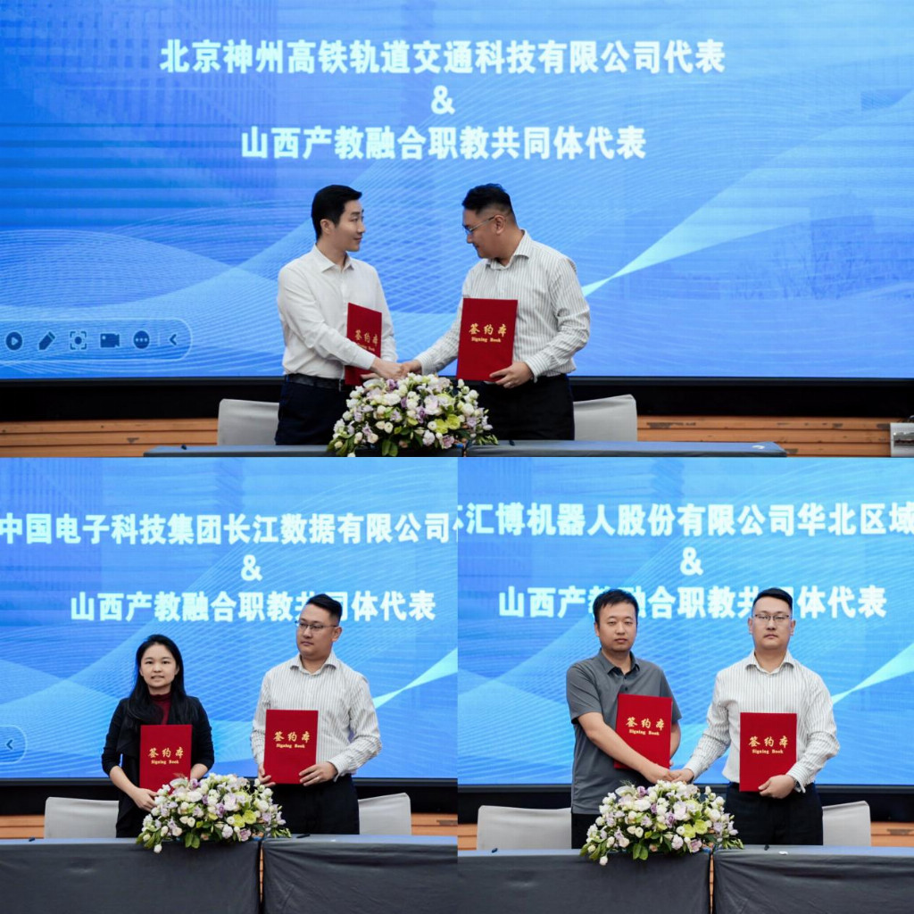 山西产教融合职教共同体现场与北京神州高铁轨道交通科技有限公司、中国电子科技集团长江数据有限公司、江苏汇博机器人股份有限公司进行了重点产业立项签约。