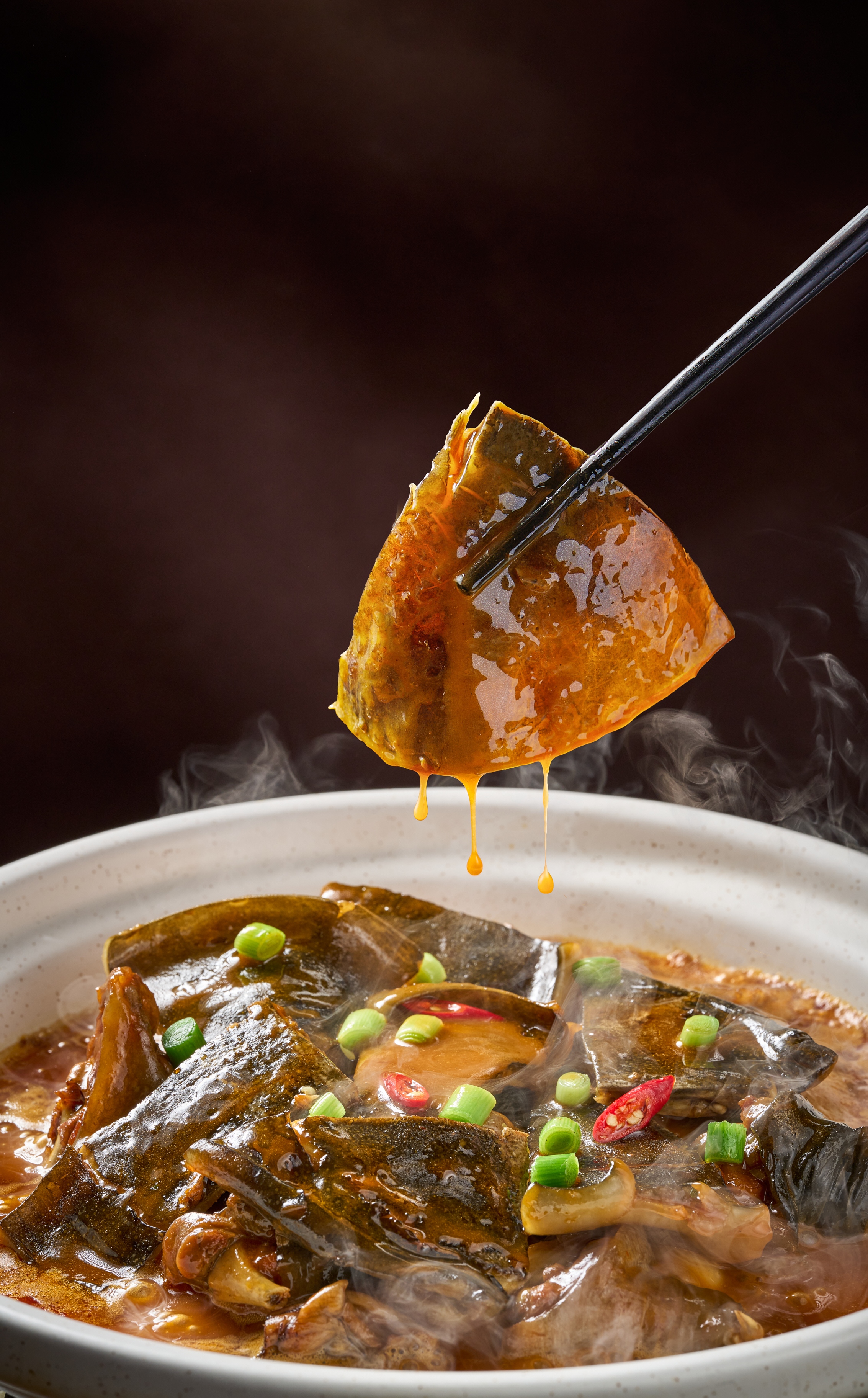 品牌深度挖掘徽州文化基因: 食材之本:黄山双石、安徽臭鳜鱼、黑毛土猪等直采原产地,以“三重油技法”(重油入味、锁鲜、提亮)激活本味;