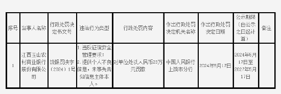 5月24日金融一线消息,中国人民银行上饶市分行发布的行政处罚信息公示表显示,因违反征信安全管理要求及提供个人不良信息、未事先告知信息主体本人,江西玉山农村商业银行股份有限公司被罚23万元。