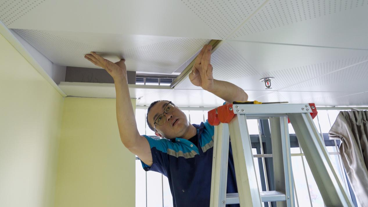盛师傅一行人分工合作,两栋楼每间房一一排查:每扇门窗拧紧螺丝、调整合页;书架、书柜以及桌椅拼接断裂部位,加固松动位置;同时修缮水龙头,固定灯标,重新安装吊顶、电源开关和门锁,一次性修整所有破损。